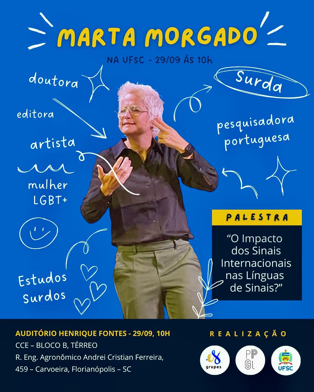 A comunidade acadêmica está convidada a prestigiar a palestra “O impacto dos sinais internacionais na língua de sinais”, a ser ministrada por Marta Morgado, no dia 29 de setembro, às 10h, no Auditório Henrique Fontes, no CCE.
