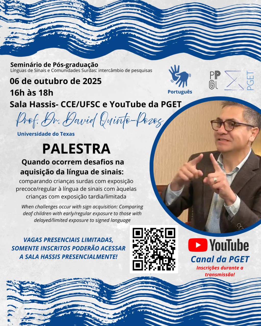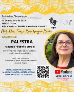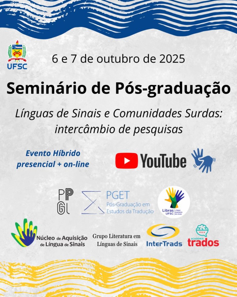 O Programa de Pós-Graduação em Linguística (PPGL/UFSC) e o Programa de Pós-Graduação em Estudos da Tradução (PGET/UFSC), em parceria com o Núcleo InterTrads, o Grupo Literatura em Línguas de Sinais e o NALS, promovem nos dias 06 e 07 de outubro de 2025 o Seminário de Pós-graduação “Línguas de Sinais e Comunidades Surdas: intercâmbio de pesquisas”.