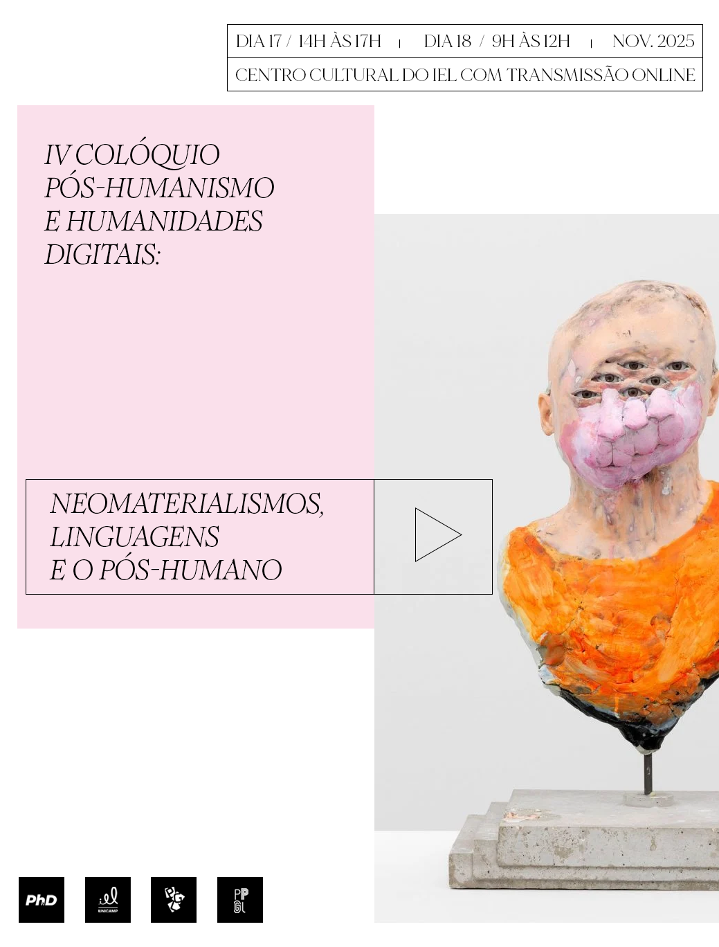 O IV Colóquio Pós-Humanismo e Humanidades Digitais: neomaterialismos, linguagens e o pós-humano acontecerá no Centro Cultural do IEL, na UNICAMP, entre 17 e 18 de novembro de 2025. O evento é uma realização do Centro de Pesquisa Pós-Humanismo e Humanidades Digitais (Ph2D) do IEL e do Programa de Pós-Graduação em Linguística da UFSC e será presencial com transmissão online.