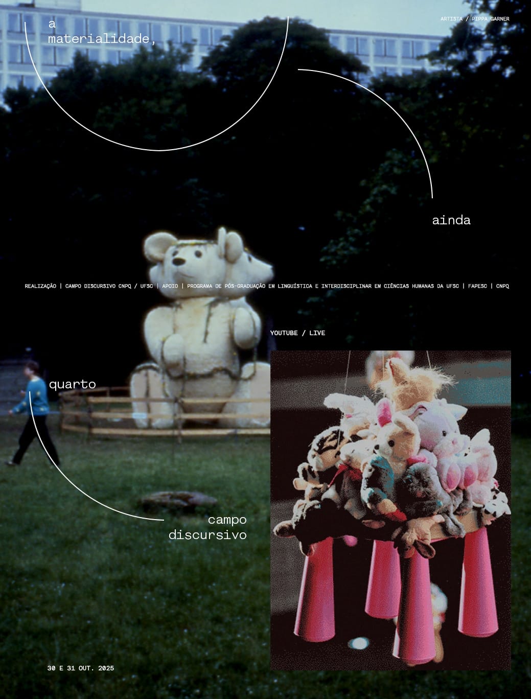 O IV COLÓQUIO INTERNACIONAL DO CAMPO DISCURSIVO acontecerá entre 30 E 31 DE OUTUBRO DE 2025, online. Trata-se da quarta edição do evento do Grupo de Estudos no Campo Discursivo (CNPq| UFSC), que tem apoio do Programa de Pós-Graduação em Linguística da UFSC, do Programa de Doutorado Interdisciplinar em Ciências Humanas da UFSC e do CNPq. O objetivo do evento é reunir pessoas pesquisadoras voltadas aos estudos discursivos em suas diferentes vertentes. O evento será gratuito e contará com conferências, palestras, mesas e sessão de comunicação oral.O tema desta quarta edição é A Materialidade, ainda. Sua escolha se deve tanto à presença dos chamados novos materialismos na discussão sobre discurso e linguagem quanto a permançencia do materialismo clássico e de suas leituras. A proposta, a partir dessas relações, é colocar em debate o que temos feito e o que podemos fazer, como analistas, com esse conceito e com seus efeitos.As inscrições estão abertas na aba INSCRIÇÕES DO SITE – https://coloquiocampodiscursivo.ufsc.br/ -